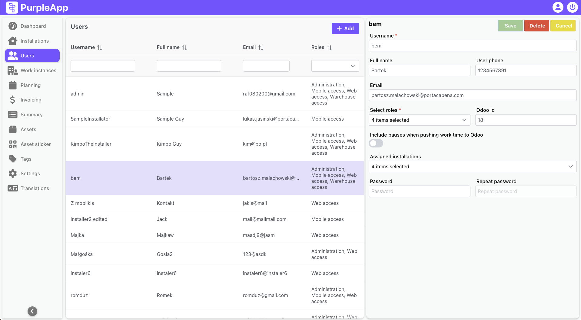 Odoo Id – used for linking PurpleApp users with Odoo contacts. This field is required for Purple to correctly send data to Odoo, but when creating a new user in PurpleApp, this user is not required to exist in Odoo for proper operation using the mobile application. OdooId will only be required when pushing installer's work data to Odoo on the Invoicing page. Purple mechanisms validate user data and will prevent pushing data if OdooId is not set.
