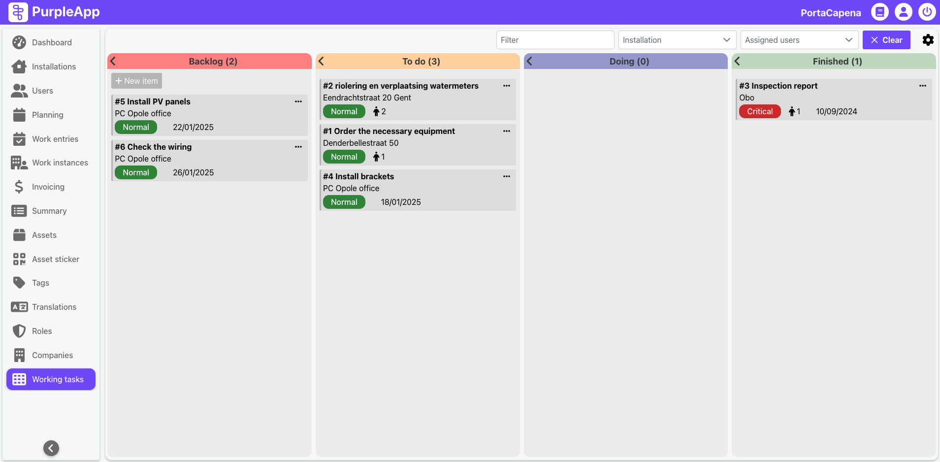 The Working Tasks screen is designed for managing specific tasks that require close monitoring. It allows for the creation and management of task lists, including when tasks can be started, who is responsible for them, and their location, based on the details specified for each task. This management is facilitated through a Kanban board, which offers several advantages for this purpose: